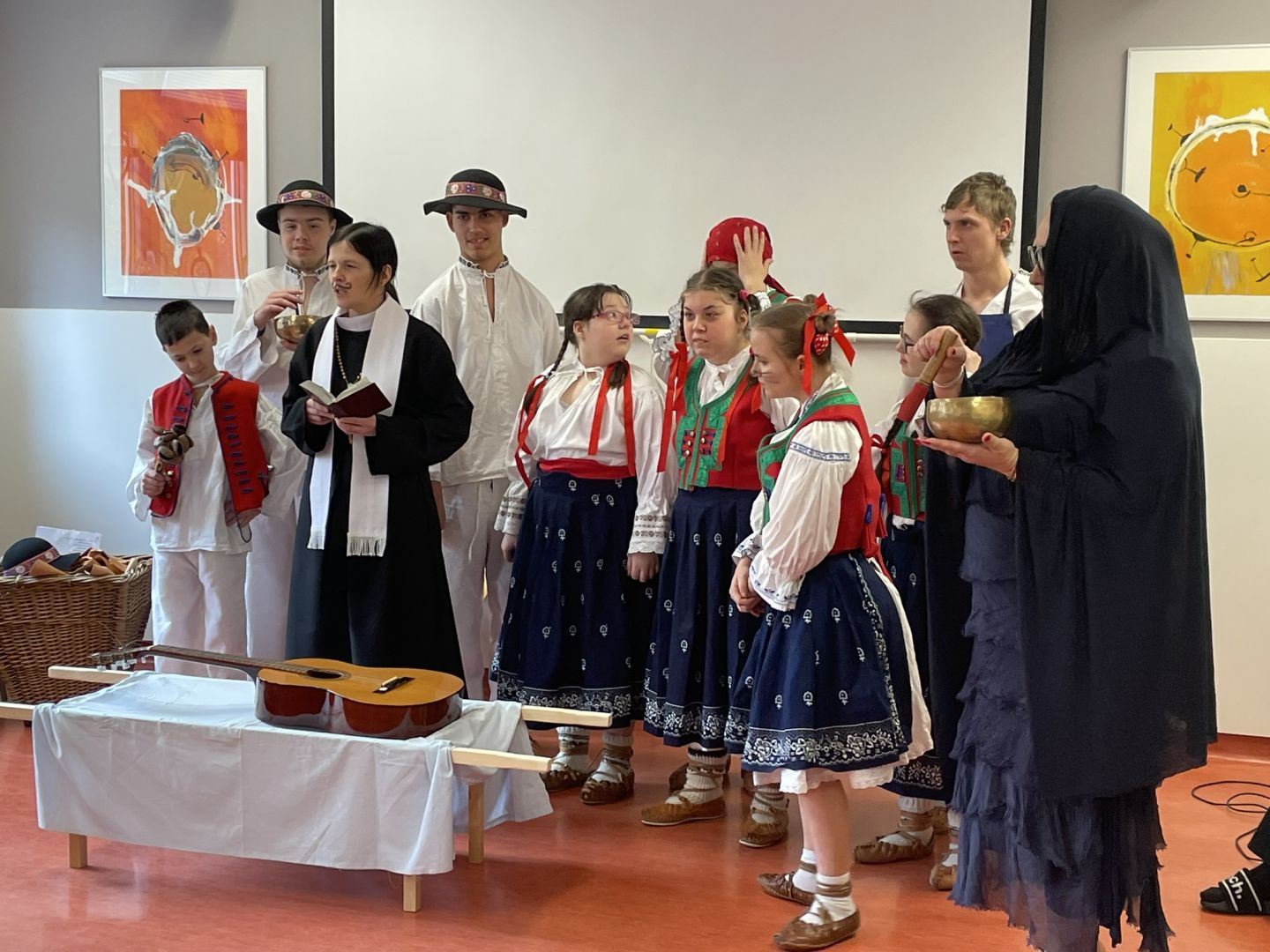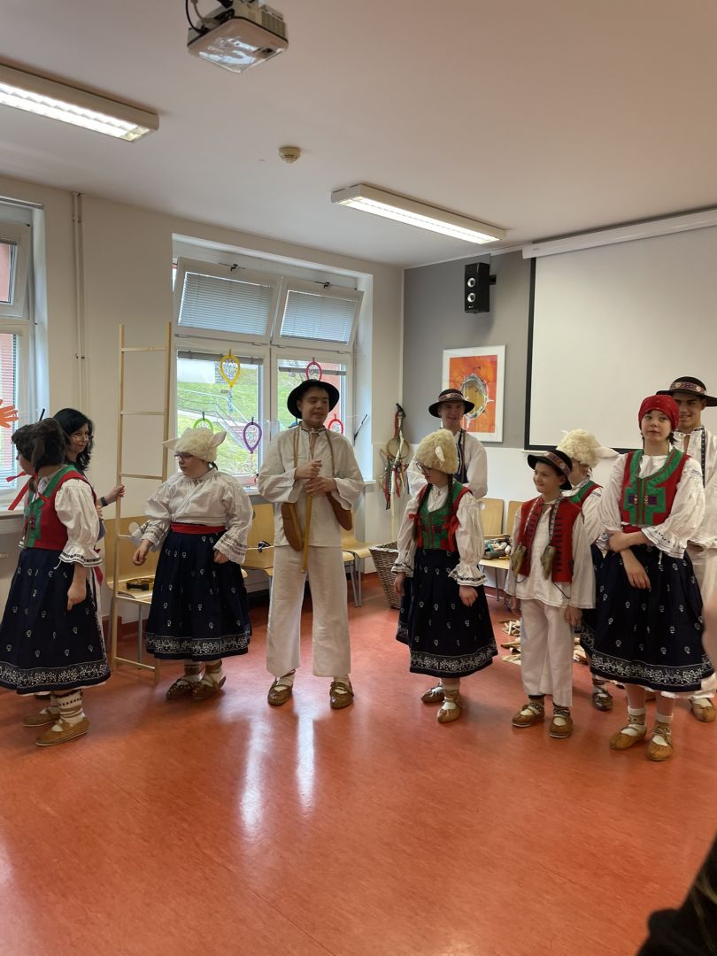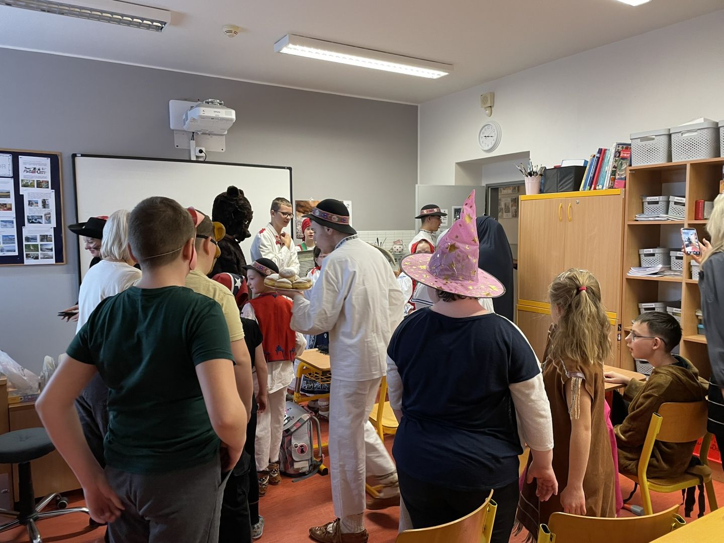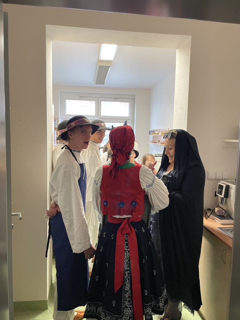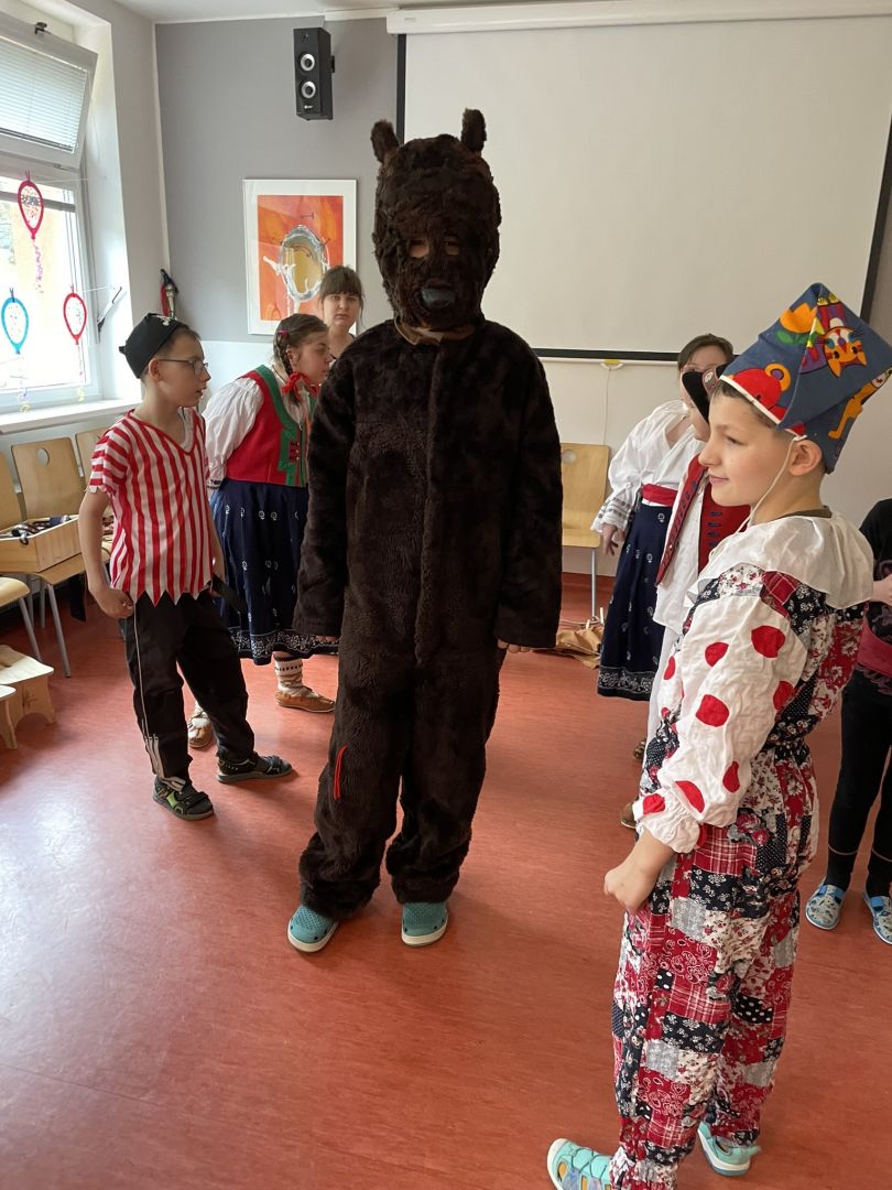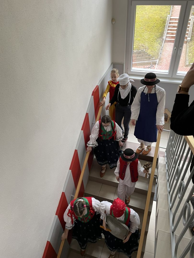 Dnes jsme si užili karnevalové dopoledne. Žáci se ve třídách seznámili s masopustními tradicemi a zvyky, vypracovali pracovní listy nebo si zahráli pohybové hry. V 9 hodin vyrazil fašankový průvod školou, medvěd se svou družinou navštívil jednotlivé třídy, kanceláře, školní kuchyň a dílnu. Poté se všichni žáci posilnili výbornými koblížky. Tancovačku maskovaných i nemaskovaných, která probíhala ve školní jídelně zakončilo vystoupení Lazovínku následované „pochováním basy“.