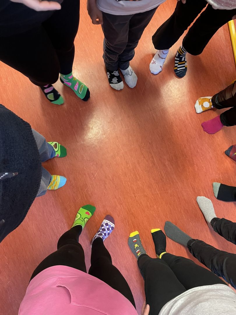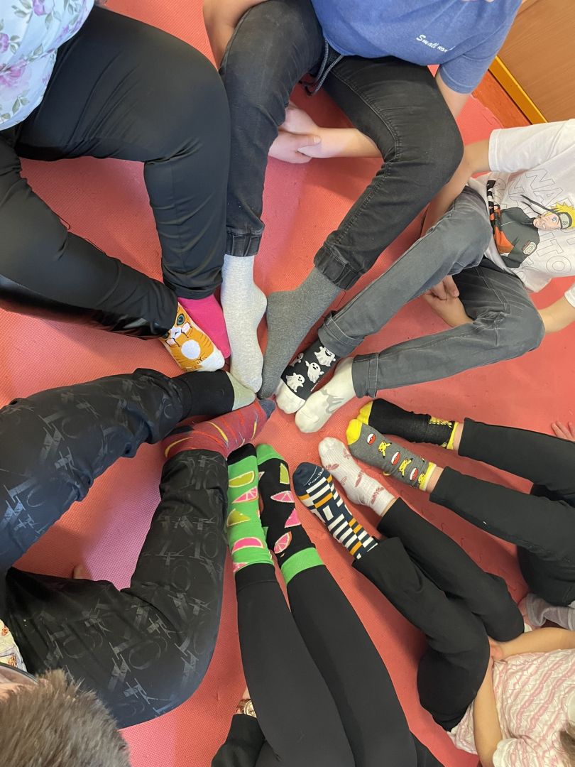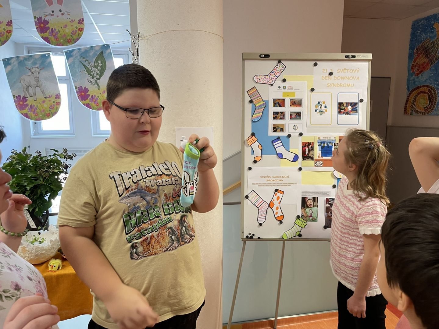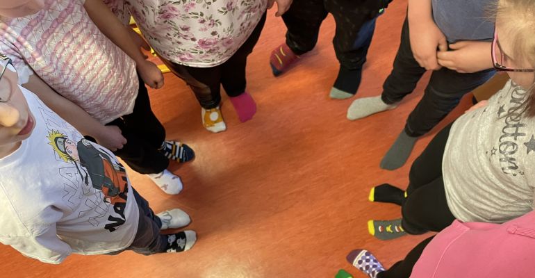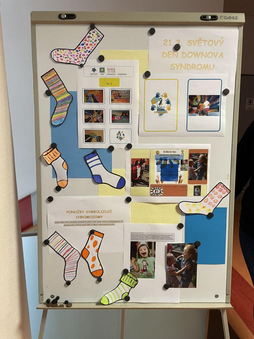 Zítřejší jarní den nesouvisí jen s příchodem teplejšího počasí a probouzející se přírodou. 21. března se zároveň slaví Světový den Downova syndromu. Datum 21. 3. symbolizuje podstatu postižení – ztrojení 21. chromozomu. Jedním z hlavních symbolů tohoto dne jsou barevné nesourodé ponožky. Když se dvě ponožky dají patami k sobě, připomínají chromozom X, a právě proto se staly výrazem podpory a solidarity s lidmi s Downovým syndromem. Pro připomínku tohoto dne si učitelé i žáci oblékli na každou nohu jinou ponožku. Žáci hledali stejné ponožky do páru, zkusili si pověsit ponožky na prádelní šnůru a také vypracovali několik pracovních listů s ponožkovou tématikou.