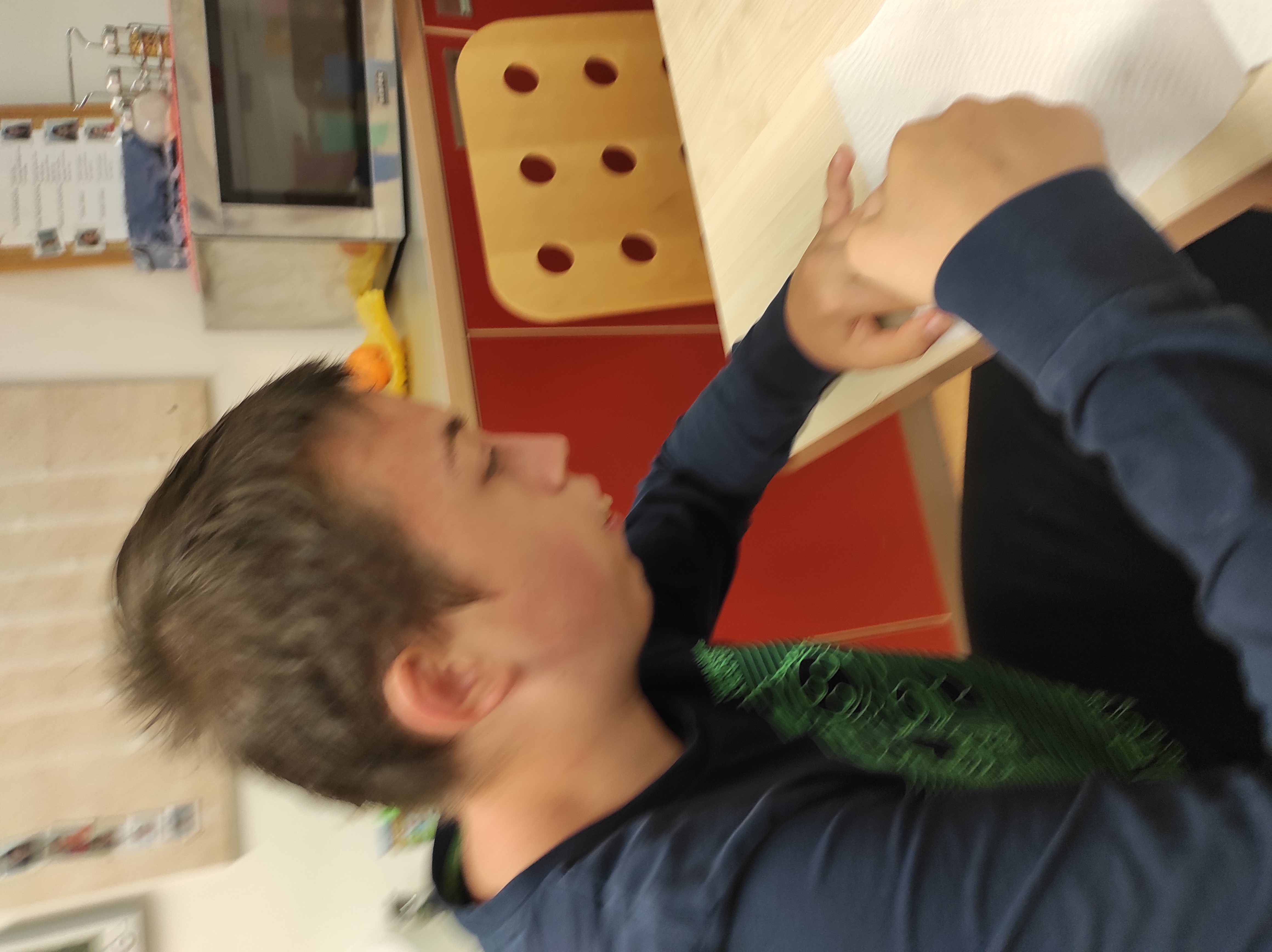 Dnešního proměnlivého počasí jsme využili k nácviku jemné motoriky a rozcvičení zápěstí rukou. Když na nás vykouklo sluníčko, šli jsem se nadýchat čerstvého vzduchu a protáhnout těla. Také jsme si zazpívali a zatleskali do rytmu. V péči o tělo máme dalšího borce.
