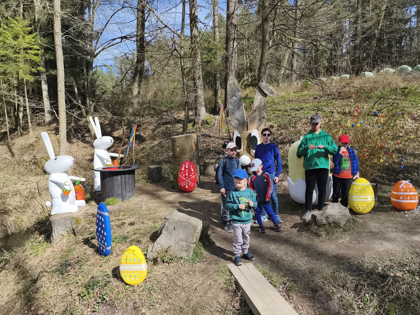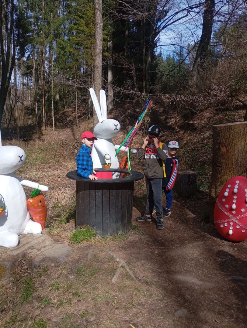 Náš velikonoční víkend  byl opravdu pestrý. V sobotu jsme si s dětmi  společně upekli  sladké beránky. Vše jsme krádně nazdobili a nachystali na pondělí. V neděli nás vytáhlo sluníčko do přírody. Prošli jsme se lesem k  rybníku  Bezedník a ke studánce Rybárka. Cestou jsme potkali v lese vyřezané dřevěné pohádkové  postavičky.
