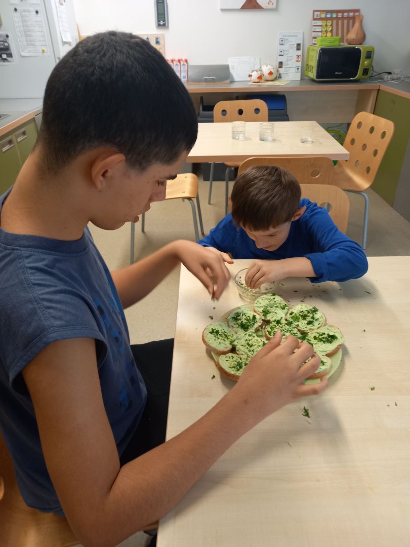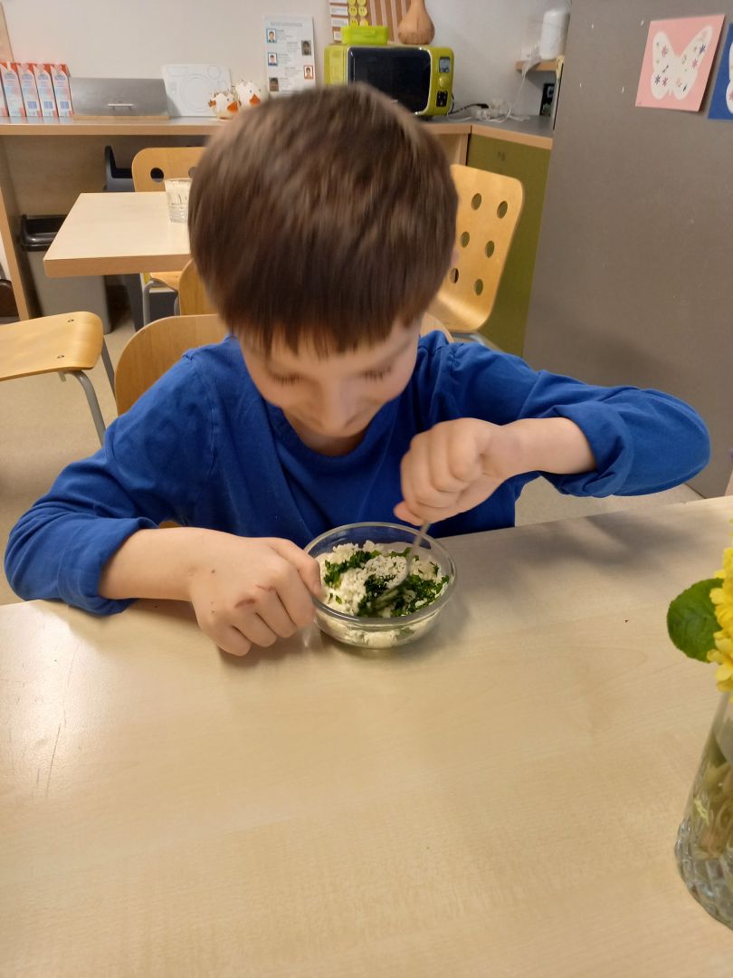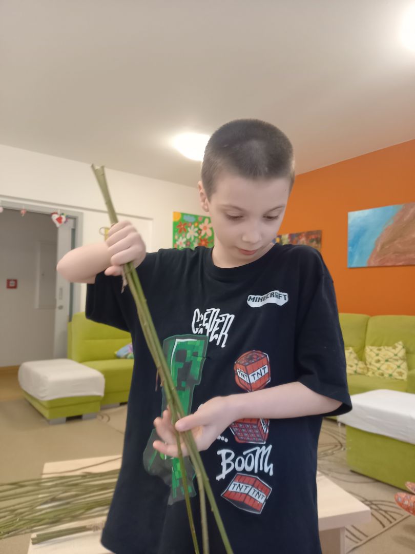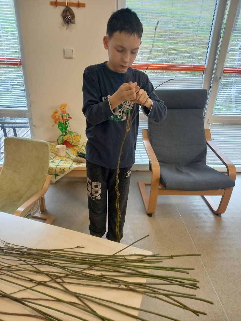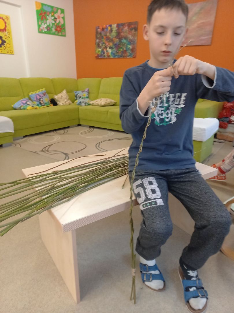 Zelený čtvrtek patřil přípravě tradičních zelených pokrmů a nápojů, abychom byli zdraví po celý rok. Děti z první rodinné skupinky si připravily pomazánku z jarních bylinek, a uvařily čaj z kopřiv. Pochutnaly si na zdravých jarních chlebíčcích. A protože jsou chlapci na této skupince v převaze, nesmělo chybět pletení a mašlení pomlázky.