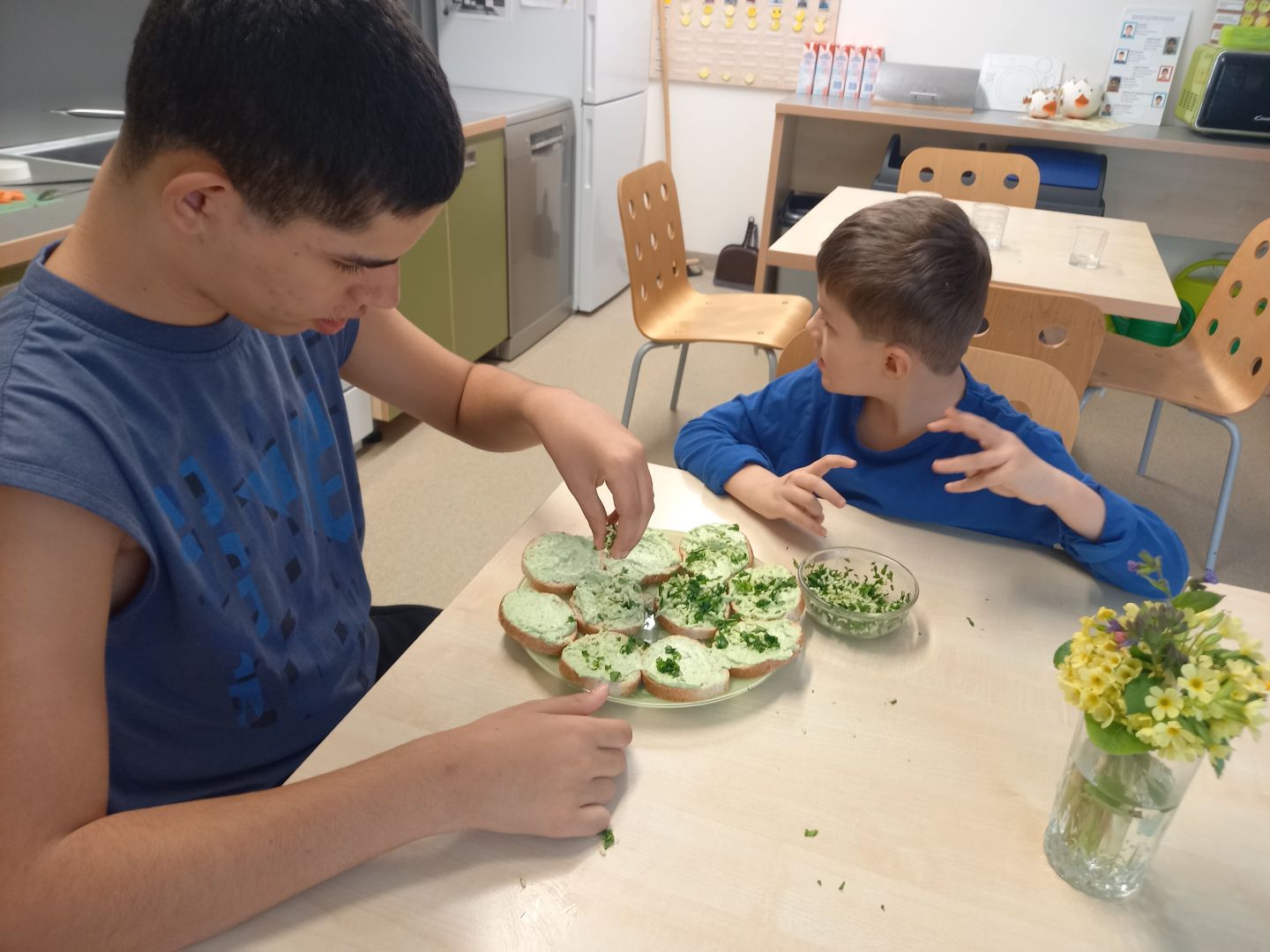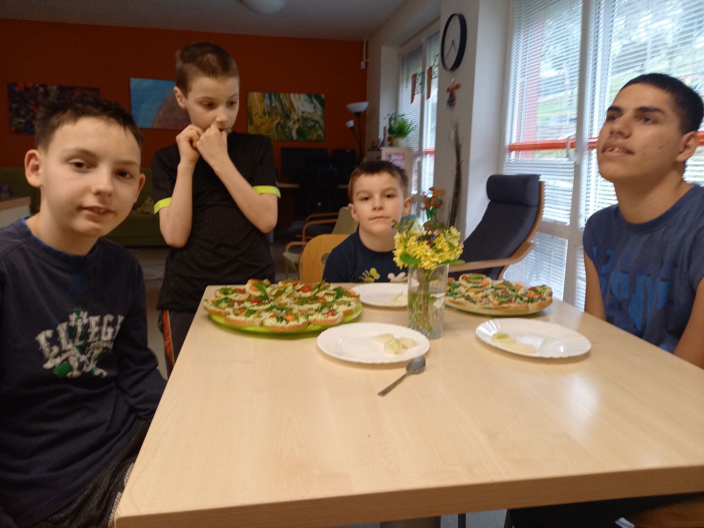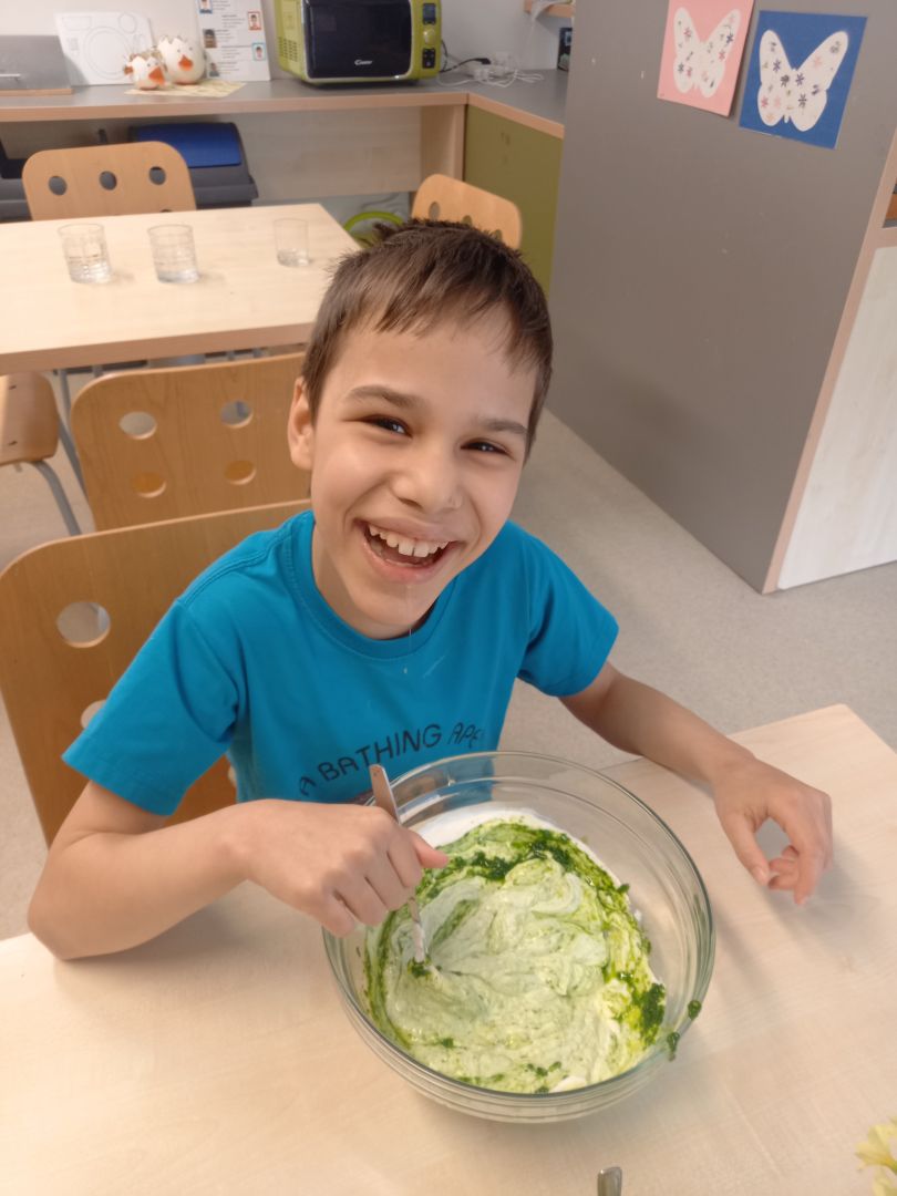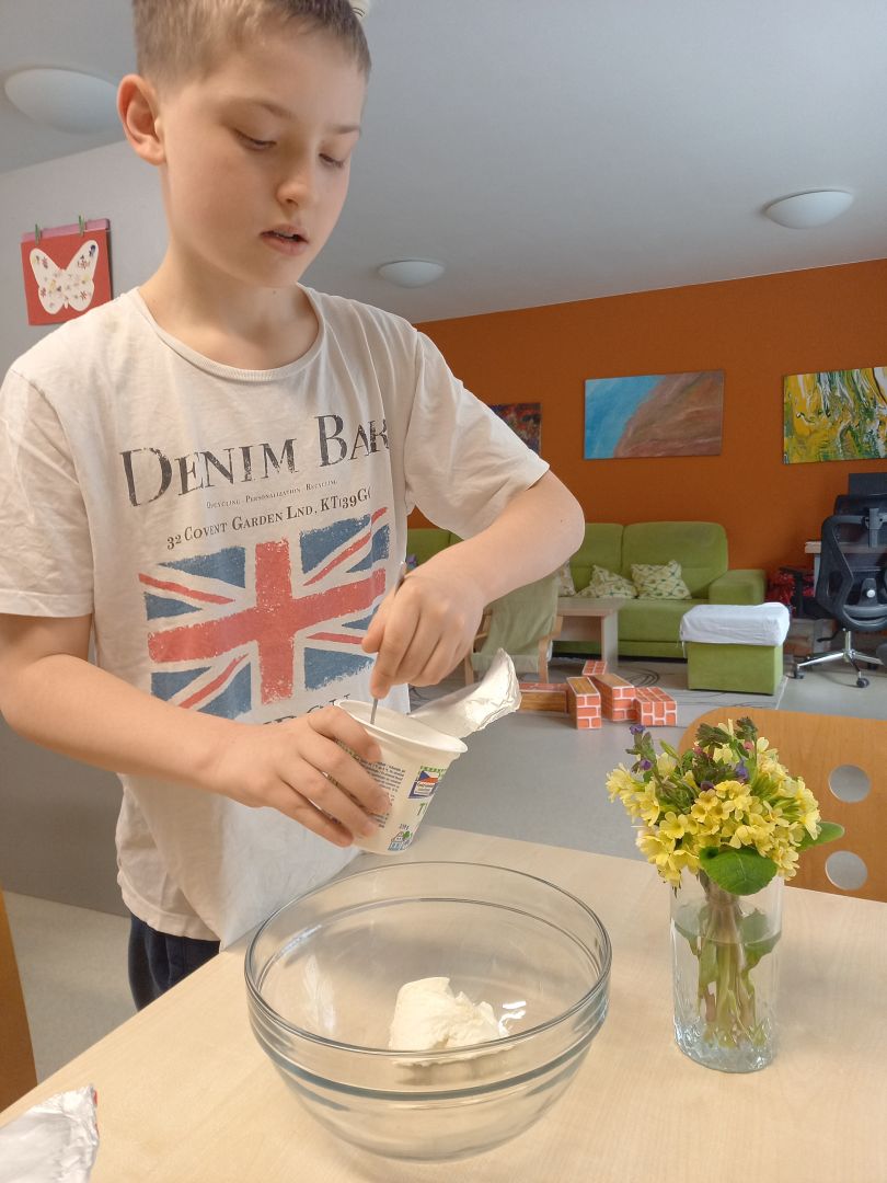 Zelený čtvrtek patřil přípravě tradičních zelených pokrmů a nápojů, abychom byli zdraví po celý rok. Děti z první rodinné skupinky si připravily pomazánku z jarních bylinek, a uvařily čaj z kopřiv. Pochutnaly si na zdravých jarních chlebíčcích. A protože jsou chlapci na této skupince v převaze, nesmělo chybět pletení a mašlení pomlázky.