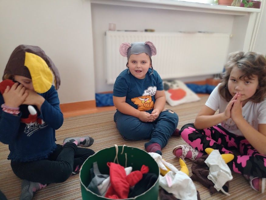 V říjnu a listopadu jsme se s dětmi seznámili s naším kamáradem pejskem, který nás provází každou naší hodinou. Otevřeli jsme náš tajemný box s kouzelnýma čepičkama a děti si vyzkoušely, jak které zvířátko mluví, chodí, jak usíná aj..